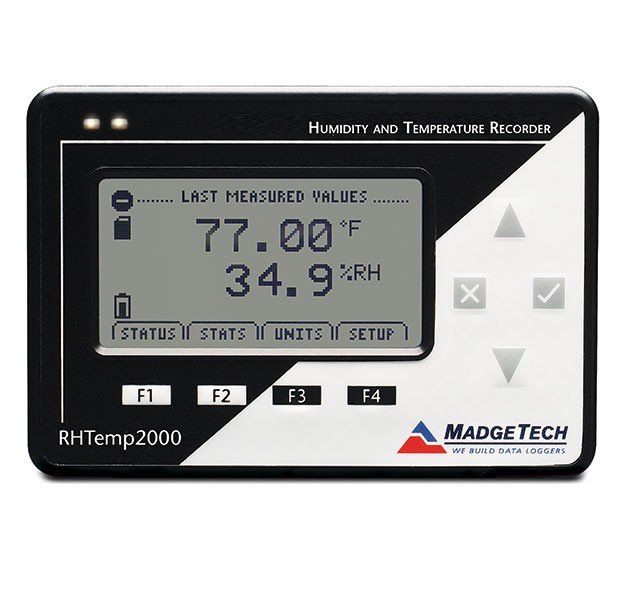 The RHTemp2000 is a humidity and temperature data logger with an LCD, perfect for applications requiring instant remote readings of these parameters. The 8-button keypad and large LCD provide convenient access to current data and data logger setup. Additionally, memory and battery levels, external power status, sampling and recording status are shown on the LCD. The RHTemp2000 comes with a wall mounted universal power adapter.
