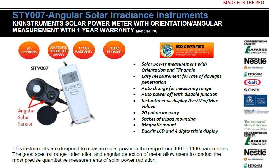 You are here: HomeProductsSolar Power TestersSTY007-KKINSTRUMENTS ADVANCED SOLAR POWER METER WITH ORIENTATION/ANGULAR MEASUREMENT