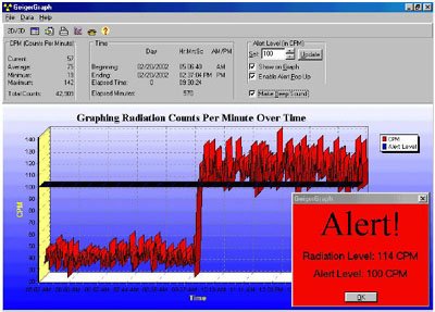 You can order the GeigerGraph software as an option when you buy the Radalert 100™ or the Inspector Alert™. Download free demo (This is a zip file; you need to unzip it to run it.) The GeigerGraph software is useful for continuous monitoring of environmental radiation. It alerts you to any elevated levels relative to your typical background count. The software gives an audible and visual alert whenever the CPM exceed a user-determined level. For example, in the picture above, the radiation level increases to above the user-set Alert Level of 100 CPM halfway through the test period, and the software issues a visual alert. Both versions require the minimum operating system of MS Windows 98, ME, NT, XP, Vista, or 7; a USB connection cable is included with each order. An optional RS-232 cable is available upon request. - See more at:  http://medcom.com/radiation-monitors/other/geigergraph-software/#sthash.y6ImTjjJ.dpuf