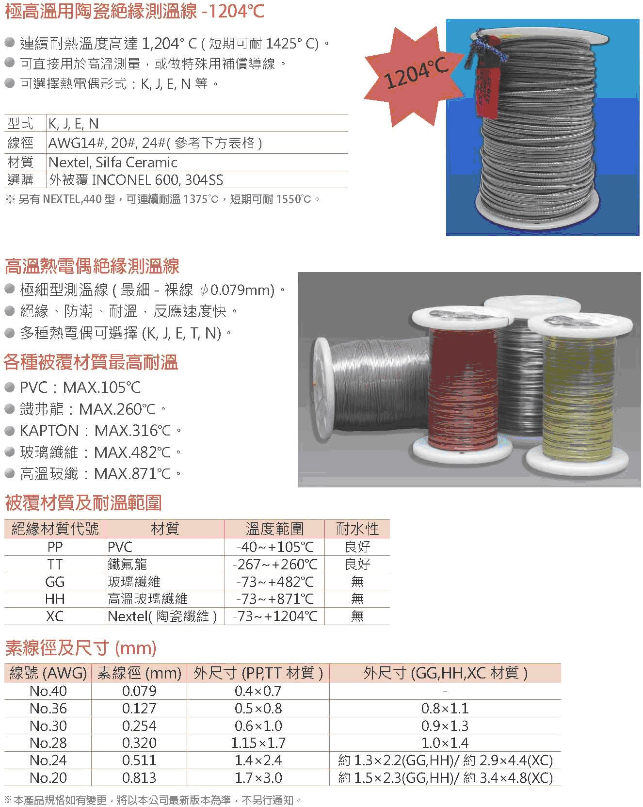 極高溫用陶瓷絕緣測溫線-1204℃連續耐熱溫度高達1,204°C (短期可耐1425°C)。可直接用於高溫測量,或做特殊用補償導線。可選擇熱電偶形式:K, J, E, N等。型式K, J, E, N線徑AWG14#, 20#, 24#(參考下方表格)材質Nextel, Silfa Ceramic選購外被覆INCONEL 600, 304SS另有NEXTEL,440型,可連續耐溫1375℃,短期可耐1550℃