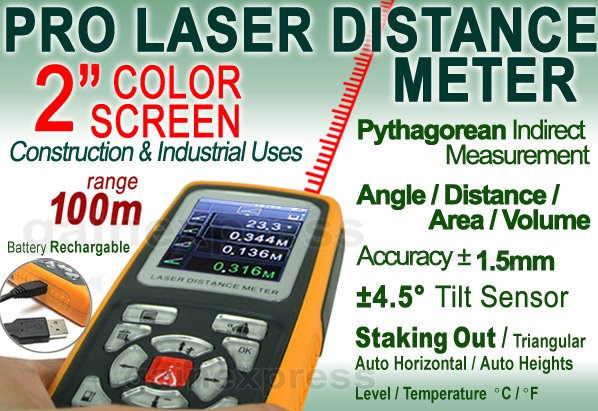 This Professional Distance Meter that uses laser & tilt sensor technologies comes with powerful interactive function& professional measuring and other auxiliary functions with unique private setting-up make your measure more enjoyable. Even in case of absence of reflecting board, this unit is capable of taking measurement up to 100m (328ft) easily due to its high precision (as high as ±1.5mm accuracy)and interference-free technology.